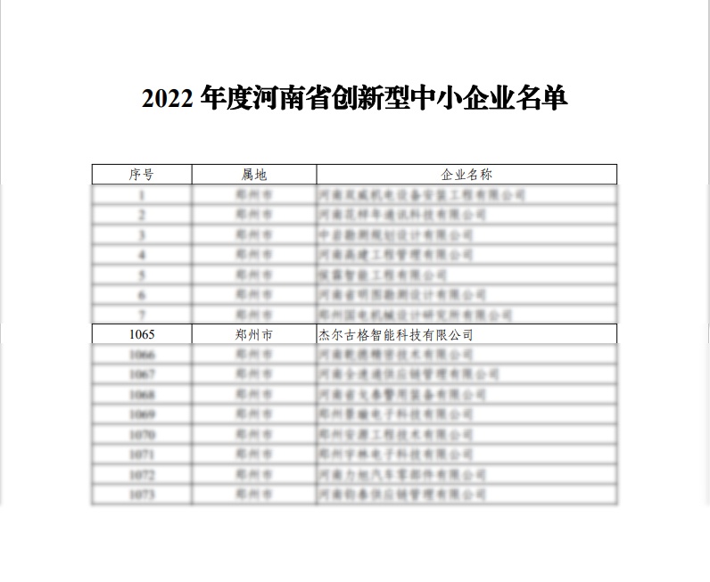 2023年3月20日,河南省工业和信息化厅公布2022年度河南省创新型中小企业名单,凭借着专业实力和创新能力,杰尔古格智能科技有限公司成功入选。